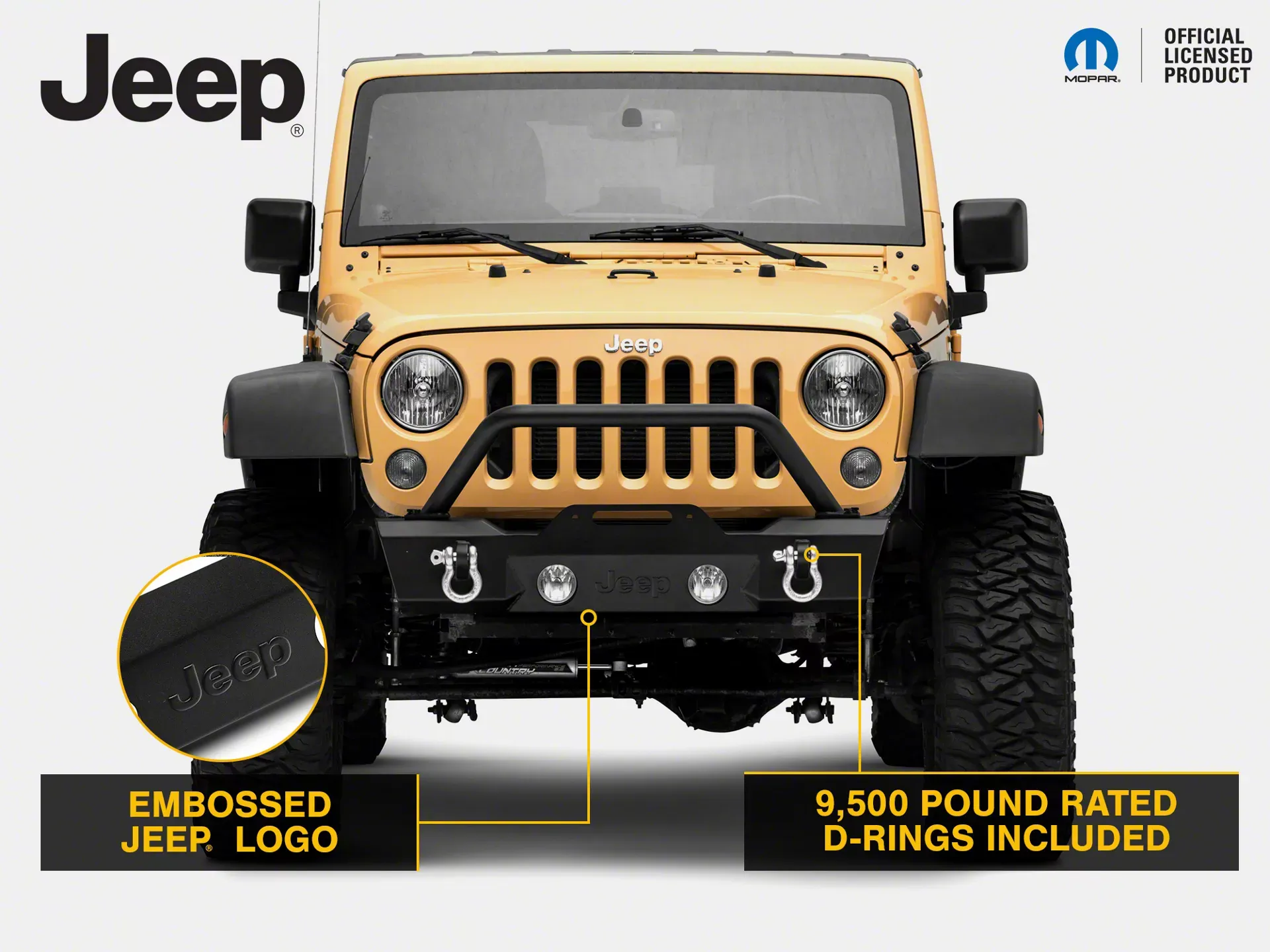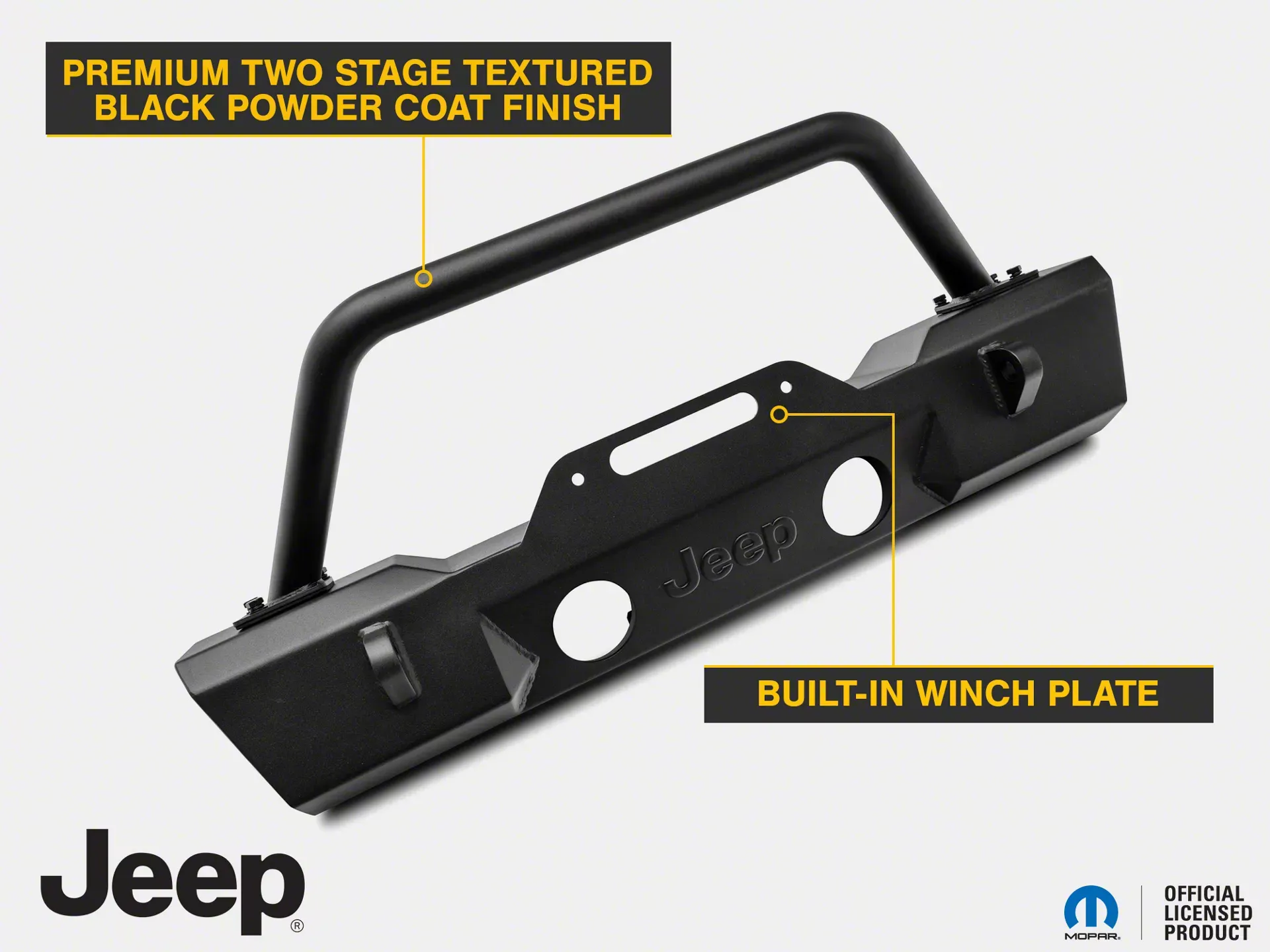 Officially Licensed Jeep Product. This Stubby Front Bumper features an officially-licensed Jeep Logo embossed on front for impressive styling. With this Bumper being officially licensed, you can be assured that it is only of the highest quality.
