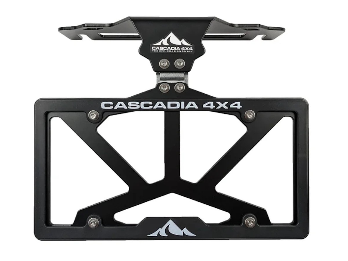 - Kit Includes License Plate Mounting Brackets (2-pieces, Black), License Plate Frame (1, Black With White “Cascadia 4×4” Logo), and all required hardware.